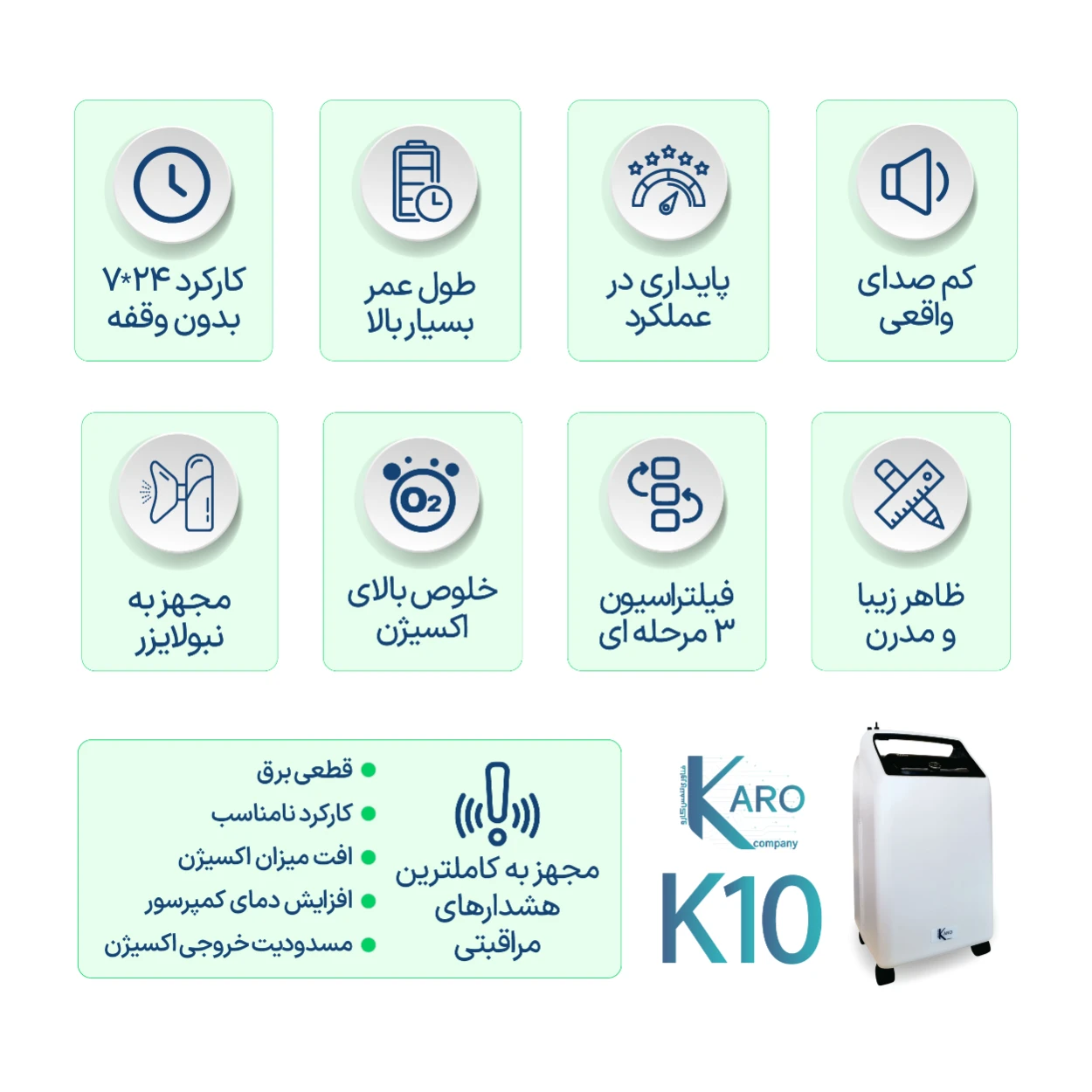 دستگاه اکسیژن ساز خانگی کارو مدل K۱۰ یک دستگاه تولید کننده اکسیژن ۱۰ لیتری است که با ساختار به روز و فناورانه خود، توانسته تمامی ویژگی های مثبت یک دستگاه اکسیژن ساز خانگی را در خود بگنجاند و پاسخی بسیار شایسته به نیازهای بیماران و ارائه دهندگان خدمات درمانی در منزل در زمینه مشکلات تنفسی باشد. بنابراین با اطمینان می توان گفت که دستگاه اکسیژن ساز ۱۰ لیتری کارو از بهترین دستگاه های موجود در ایران می باشد.